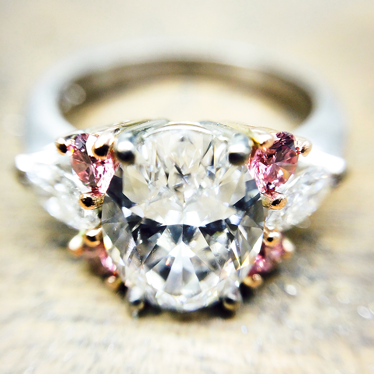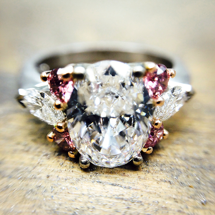 Diamond tourmaline and platinum cocktail or engagement ring, fabricated, stone set and polished in-house at Max Diamonds at our Hatton Garden workshops.
