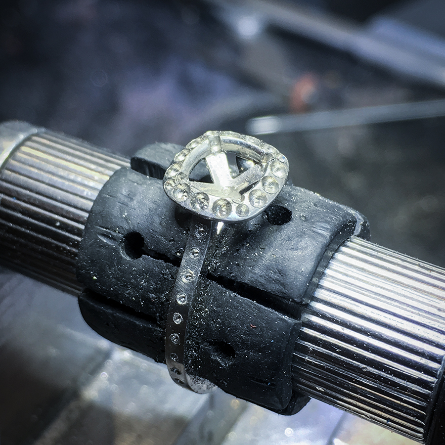 Diamond setting our hand fabricated rings on the bench in our Hatton Garden workshops.